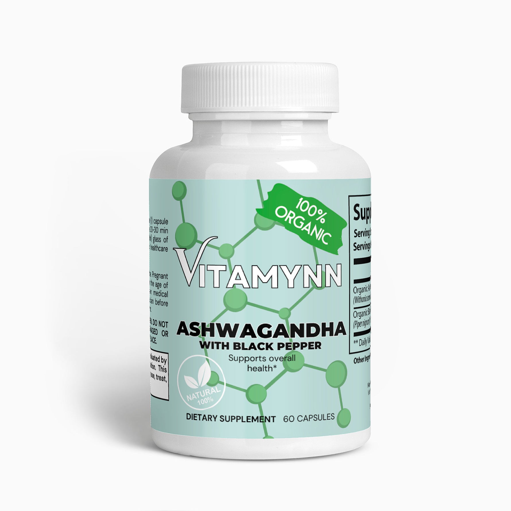 Ingredients: Organic Ashwagandha (Withania somnifera)(root), Organic Black Pepper (Piper nigrum)(fruit), pullulan capsules.